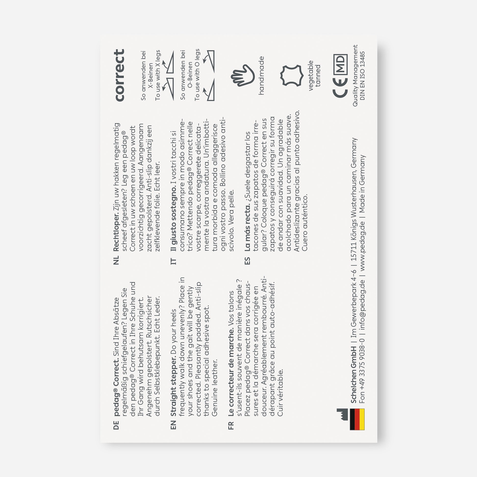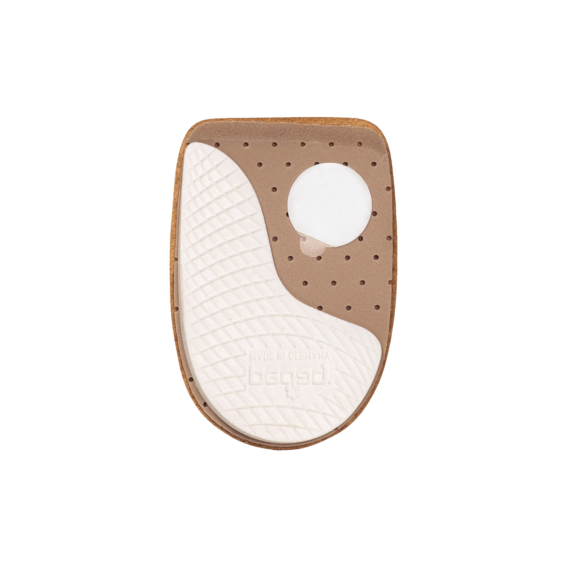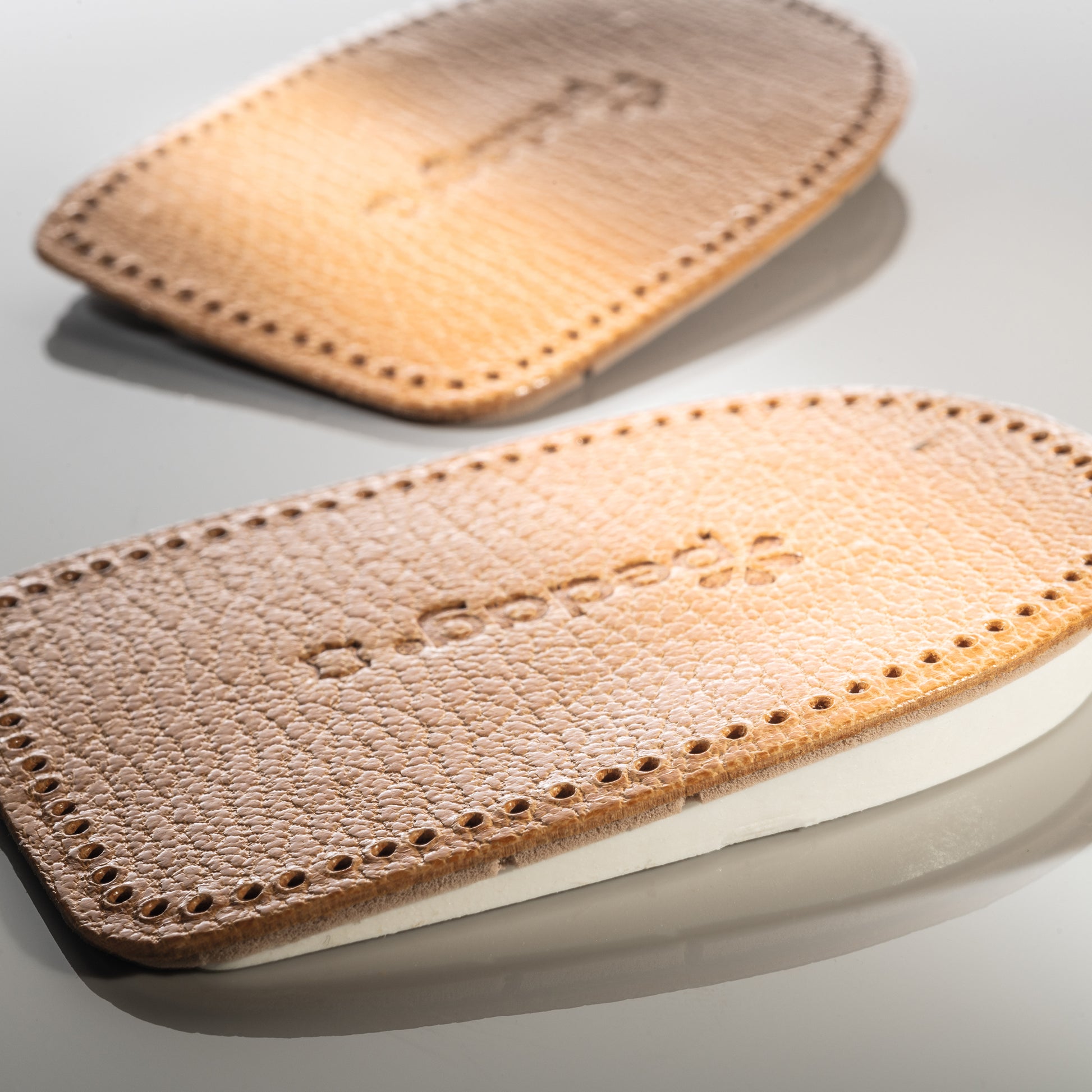 解剖学に基づいて設計された、かかとの片減り予防、O脚・X脚歩行対策インソール。外側を高く、内側を低く傾斜をつけた構造で、外側に偏った重心を自然に内側加重にサポートします(O脚歩行対策に使用される場合)。・本革製・接着シール付※シールの接着力が低下するため貼り直しはできません。