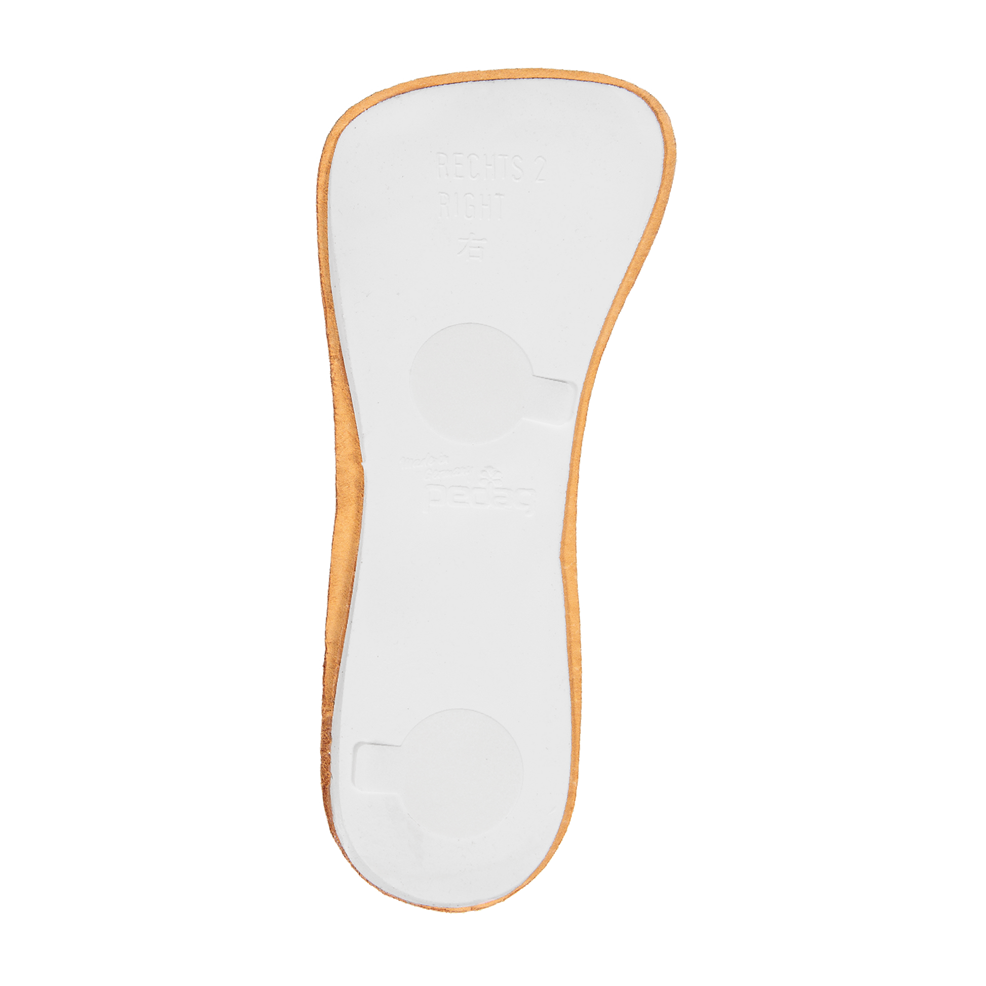 かかとから中足部にかけて外側が高く内側に傾斜している特殊設計により、外側に偏った重心を内側加重にサポートします。コレクトよりもさらに広範囲でのサポートができ、O脚歩行対策に最適なインソールです。3/4サイズなので靴内でつま先を圧迫しません。・本革製・接着シール付(2ヶ所)※シールの接着力が低下するため貼り直しはできません。